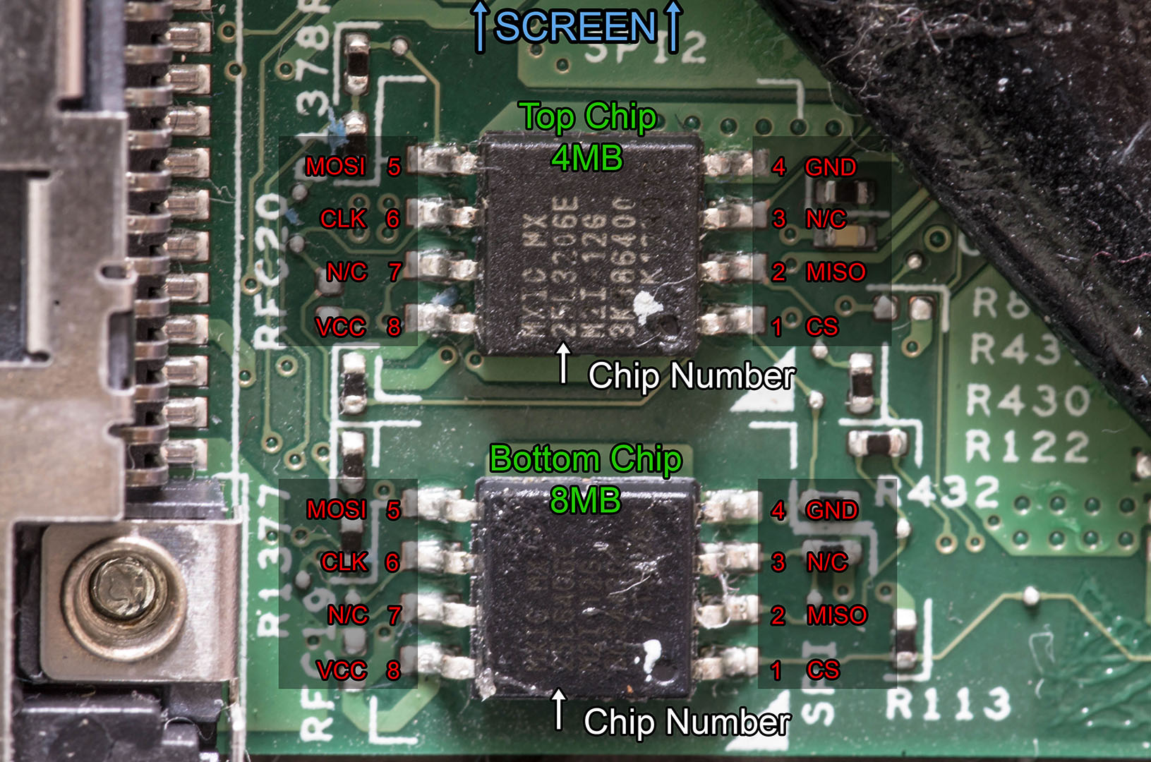 The bottom chip is MX25L6406E/MX25L6408E in my case: