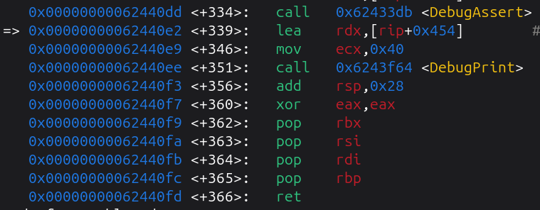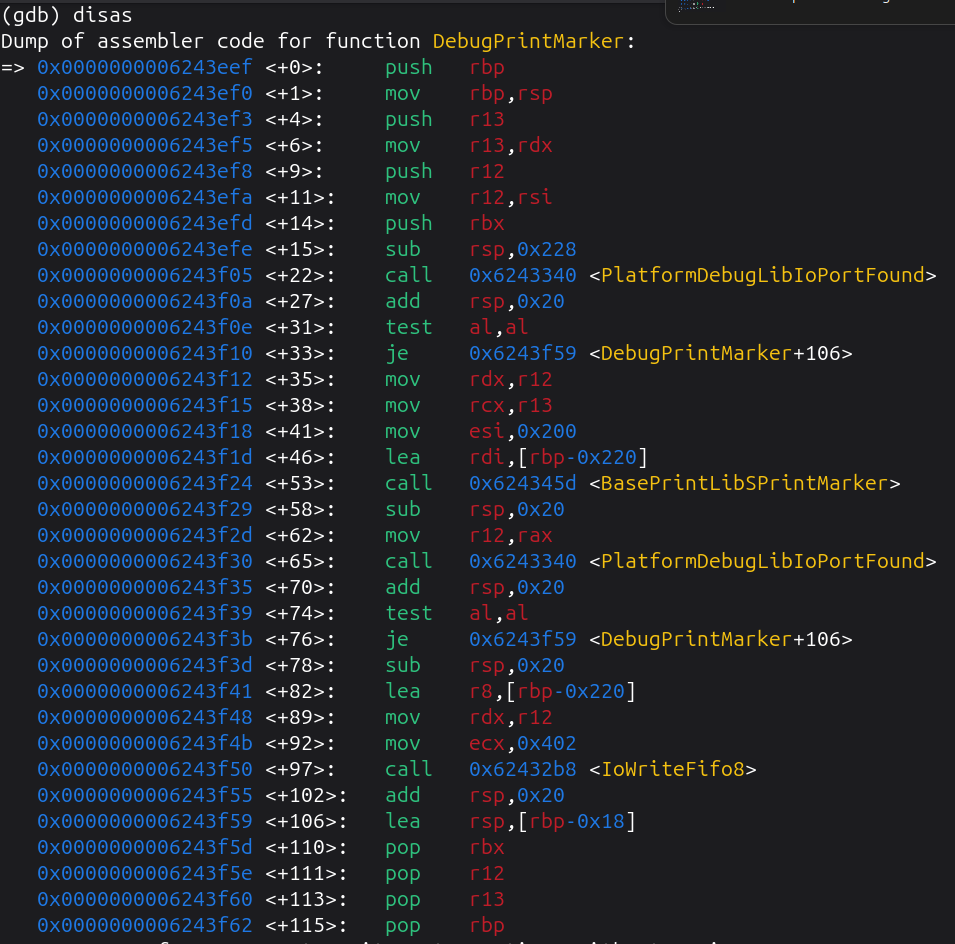0x0000000006243f8e <+42>: retThe message is passed to rsi, while the 0x40 value is passed to rdi. Then it calls DebugPrintMarker: