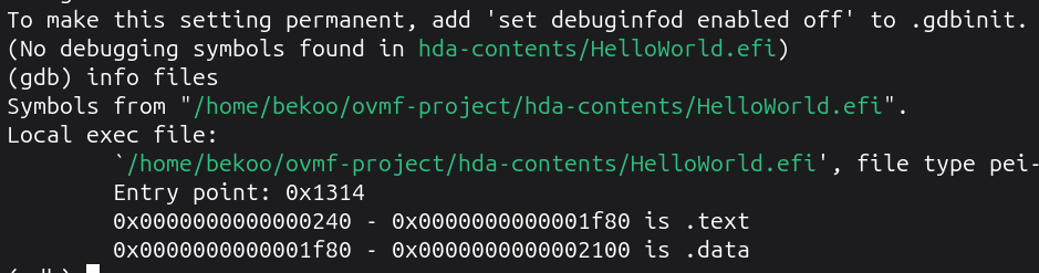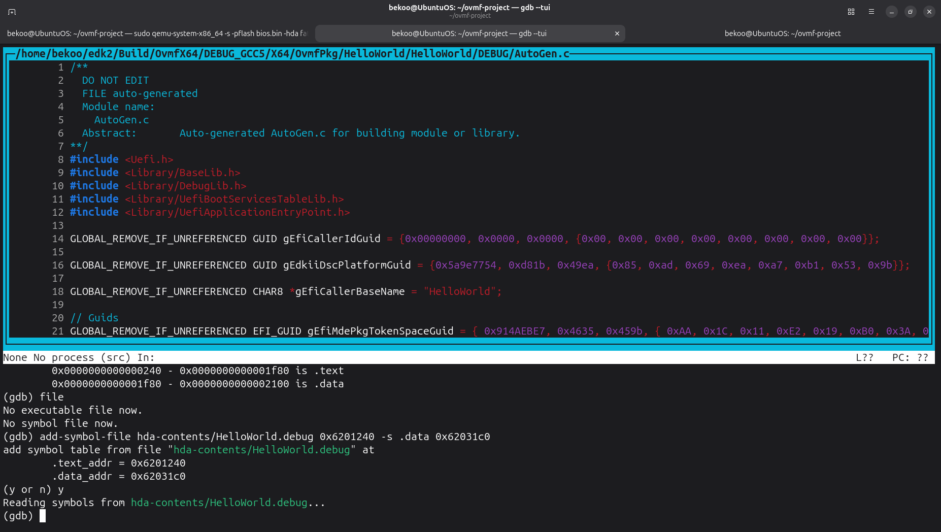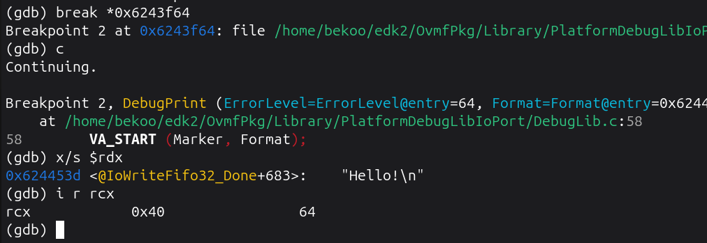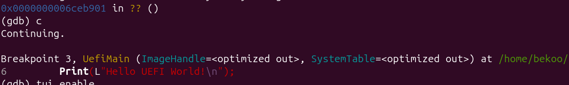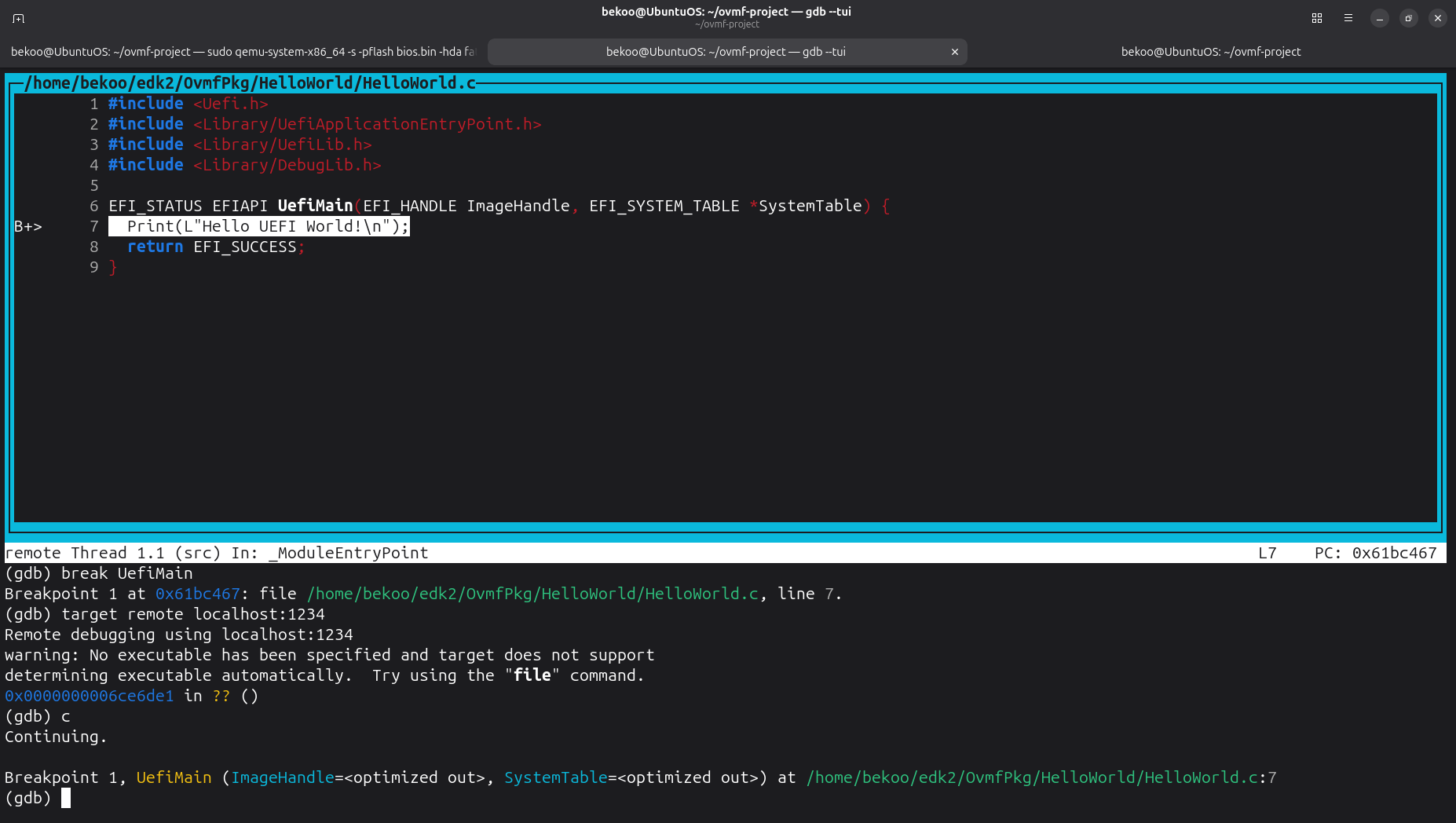 Breakpoint 1 at 0x6202467: file /home/bekoo/edk2/OvmfPkg/HelloWorld/HelloWorld.c, line 7.