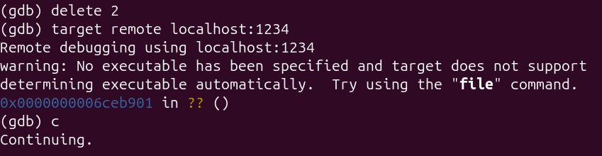 Continuing.Run HelloWorld.efi again and check the GDB: